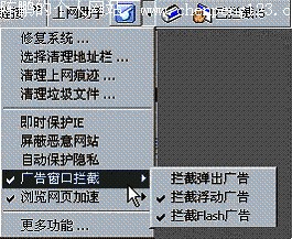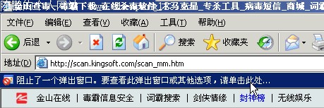 1. 首先,要确认您使用的浏览器版本,推荐使用IE浏览器,并且最好是IE6.0以上的版本,不支持非IE内核的浏览器。 2. 使用在线杀毒或在线木马专杀时,最好以系统管理员身份登陆,以保证对系统有完全的操作权限。 3. 检查您的IE的安全等级,一定不要设置为高。可以单击IE工具菜单下的选项,在安全页查看和修改。 4. 确保您的系统盘有至少不低于10MB磁盘空间可用。 5. 确保您的系统没有启用3721上网助手的拦截广告功能(除3721外,其它的广告拦截软件也要关闭相应功能)。 关闭3721拦截广告功能的操作为在IE工具栏,单击上网助手图标右边的下拉按钮,选择广告窗口拦截,取消选中拦截弹出广告。如下图: