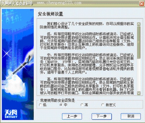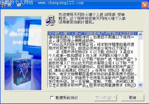 天网防火墙个人版(简称为天网防火墙)是由天网安全实验室研发制作给个人计算机使用的网络安全工具。它根据系统管理者设定的安全规则(Security Rules)把守网络,提供强大的访问控制、应用选通、信息过滤等功能。它可以帮你抵挡网络入侵和攻击,防止信息泄露,保障用户机器的网络安全。天网防火墙把网络分为本地网和互联网,可以针对来自不同网络的信息,设置不同的安全方案,它适合于任何方式连接上网的个人用户。 如何安装天网试用版 天网防火墙个人版系统环境要求: 软件环境: Microsoft Windows 98 Microsoft Windows ME Microsoft Windows NT(SP6) Microsoft Windows 2000 professional Microsoft Windows XP 硬件环境: PC兼容计算机或Intel x86的微处理器 至少64MB RAM,建议96M(配合操作系统软件之最低需求) 至少8MB硬盘空间,建议16M 1.双击已经 下载 好的安装程序,出现如下图所示的安装界面:
