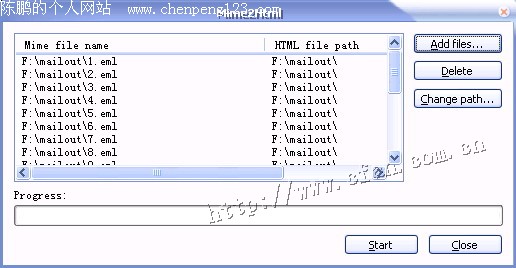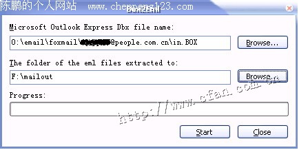 第二步:在弹出的对话框Microsoft Outlook Express Dbx file name(可能是作者的失误,所有的邮件导出界面都显示为Microsoft Outlook Express)文本框中填写Foxmail的邮件保存路径(见图1)。一般来说,Foxmail的收件箱对应的文件是in.box,发件箱对应的是sent.box。在The folder of the eml files extracted to文本框中填入转换后邮件的放置地点。一切准备好后点击Start按钮即可。