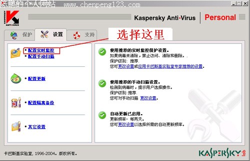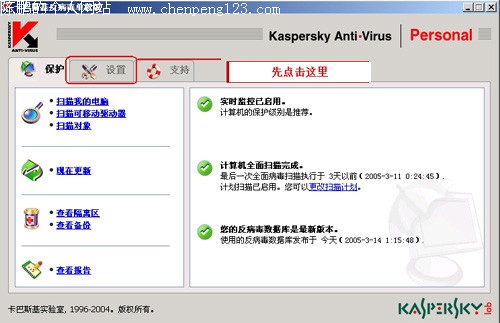 “卡巴斯基杀毒软件”是一款很不错的杀毒软件,无论是国内还是国际上的病毒,它都能从容面对。但是,最近论坛上总有朋友不是抱怨卡巴使系统运行速度变慢,就是抱怨卡巴的杀毒速度无法忍受。其实,只需要通过下面的几个步骤设置一下,就能够提高卡巴的使用效率! 步骤一 先选择“设置”选项卡;