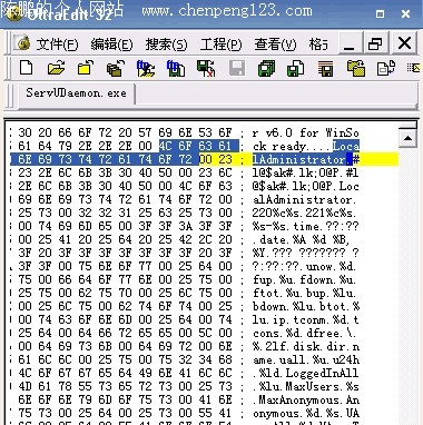 用Ultraedit打开分析Serv-U的帐号密码,并修改编译上传运行,那前面做的工作都没有作用了,因为这里默认管理端口在程序文件中已经修改,在ServUDaemon.ini中也已经修改,这样来说默认的管理员连接不上了。