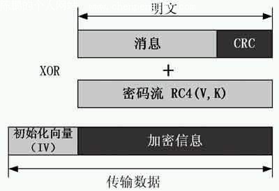 3、传输。将初始化向量和密文串接起来,得到要传输的加密数据帧,在无线链路上传输。(如图二所示)