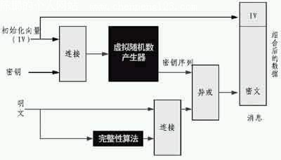 (3)经过校验和计算的明文与虚拟随机数产生器的输出密钥流进行按位异或运算得到加密后的信息,即密文。