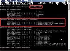 第三步就是记录下Target机器的MAC地址。一旦成功连接到网络上,就把被攻击的Target计算机的MAC地址记录下来。方法有两种,一是打开一个命令提示符窗口并输入ipconfig/all命令也可看到这个MAC地址,这个窗口的内容如下图七所示(无线网卡的MAC地址信息已高亮度显示)。