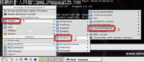 单击Programs 图标,然后是Auditor,再 Wireless,, 然后Scanner/Analyzer,最后是 Kismet ,来运行Kismet程序。如图十二所示。