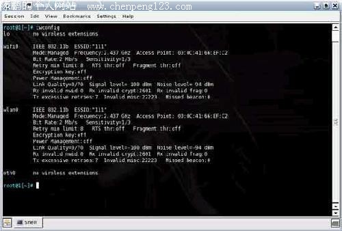 在这里,开始做其他任何其他的事情之前,先要确认我们机器上的无线网卡能够通过Auditor的验证。单击Command Line图标以打开一个命令行窗口,然后输入iwconfig命令,在Auditor显示出的信息中,你会看到有关于“Wlan0”的信息,它是Auditor为基于PRISM芯片的卡确定的一个名称,如果用来操作攻击的笔记本的屏幕显示如图十一所示的窗口,则表明Auditor已检测到了无线网卡,现在就可以开始下一步工作了。对于另外一台笔记本,也进行同样的步骤,重复这一操作。