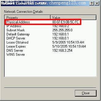 二是在Windows XP中,可从“无线连接状态”窗口来得到这个MAC地址,单击“支持”按钮,然后单击“详细信息”,这个MAC地址就显示在窗口顶端的右边(如图八所示),当然,不同的机器显示的名称可能不尽相同,另外的计算机显示的就可能如“物理地址”这一类的描述信息了。在这个窗口的信息,组成MAC地址的字母和数字被短划线分隔,短划线的目的只是使这些字符看得更清楚,但实际的MAC地址是没有这些短划线的。