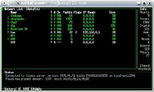 Kismet是一个基于Linux的无线网络扫描程序,这是一个相当方便的工具,通过测量周围的无线信号来找到目标WLAN。虽说Kismet也可以捕获网络上的数据通信,但在还有其他更好的工具使用(如Airodump),在这里我们只使用它来确认无线网卡是否正常工作和用来扫描无线网络,在下面的部分中将会换用不同的工具软件来真正地侦听和捕获网络上的数据通信。
