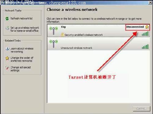 当void11在Sniff计算机上运行时,我们来看看Target计算机上正在发生的变化,通常,使用这台机器的用户会发现网络突然地变得非常慢,而且最后好像停顿了,几秒钟后,彻底与网络失去了连接。如果查看Windows XP自带的无线客户端实用程序,会发现void11开始攻击之前,一切都正常,Windows显示你正连接在AP上,Void11启动后,网络状态会从连接状态改变到断开状态。如图十九所示。如果在在Sniff计算机上停止void11后,Target计算机会在大约几秒钟内重新连接到目标AP。