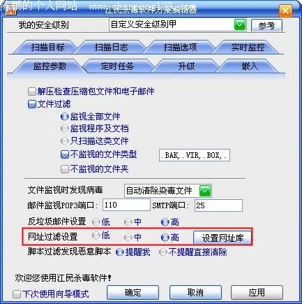 网络已成为人们获取信息的重要来源,不清楚不明白的事只要上网一搜就可解决问题。 本人就是这样的一个网上“搜”客,可是在畅游网络的同时,不经意间常常中了恶意网站的“埋伏”,不是感染了病毒,就是主页被篡改。除了上网常常中招,在聊天时也时常收到带毒网址,由于是好友所发,有时总让人真假难辨,稍不留言就又染上病毒。 前不久听说老牌杀毒厂商江民科技出了KV2006,其中有一项恶意网址过滤功能,可以解决这些让人头疼的病毒问题。 打开KV2006主界面,选择“工具”里的“设置”选项,打开“监控参数”菜单,设置好 “恶意网站过滤设置”,就能轻松躲避恶意网址陷阱。(如图1)