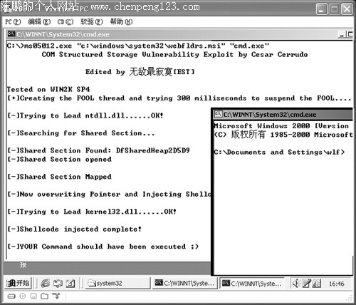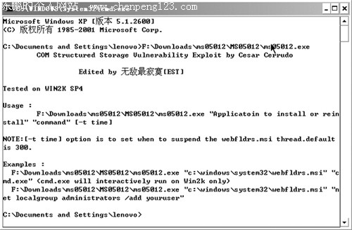 据称Windows COM结构存在安全问题,本地或远程攻击者可以利用这个漏洞提升特权或执行任意指令。受影响的操作系统和程序在处理COM结构化存储文件时,在访问共享内存的方式中存在权限提升漏洞,一个已登录的用户可利用此漏洞完全控制系统。 安全公告牌 这是一个权限提升漏洞。 成功利用此漏洞的攻击者可以完全控制受影响的系统。 攻击者可随后安装程序;查看、更改或删除数据;或者创建拥有完全用户权限的新账户。 要利用此漏洞,攻击者必须能够本地登录到系统并运行程序。 受影响的系统包括:Windows 2000(SP3、SP4),Windows XP(SP1、SP2),Windows 2003,以及Windows 98等操作系统。使用了Windows OLE组件的Office XP、Office 2003等办公软件也会受到影响。 漏洞的形成原理 Webfldrs.msi是Windows系统Web文件夹中的修复工具,Webfldrs.msi组件在卸载的时候由于权限的问题而出错,从而弹出一个提示窗口。这时线程被挂起,新线程创建初期会创建一个堆对象,而正好这个对象可以被写入,攻击者正是利用这个写入的机会将已经准备好的ShellCode写入到这个对象中,从而执行自己的ShellCode。 提示:ShellCode是一组可以完成我们想要的功能的机器代码,这些代码通常都是以十六进制的数组形式存在的。 实战提升权限 我们将会利用这一漏洞进行本地权限的提升实验和远程权限的提升实验。 首先打开一个命令提示符窗口,运行漏洞利用工具并查看该工具的使用说明(图1)。从图中我们可以看到该漏洞利用工具的使用说明非常详细,该工具可以根据不同的操作系统来执行不同的命令。