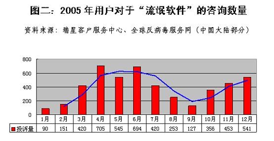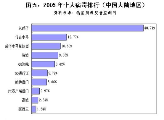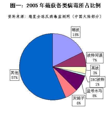 报告节选一:病毒以经济利益为目的 灰鸽子、盗号木马等数量剧增 瑞星全球反病毒监测网的统计数据(中国大陆部分)显示,2005年被截获的新病毒数量达到了72836个,比2004年增长了一倍还多。 2005年截获的新病毒中,很多属于同一病毒种族的不同变种:其中新增波特类(Bot)病毒变种数为23844个,瑞波变种12389个、波特间谍变种4920个、高波变种2352个、IRC波特变种850个。 2005年新病毒中“盗号木马”的数量为5484个,由国内作者编写的“灰鸽子”木马成为本年度头号病毒,它危害极大,变种极多(共有4257个变种),是国内近年来非常罕见的恶性木马病毒。