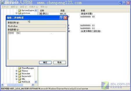 现在,大家对计算机的安全性越来越重视。为了保证电脑的安全,一定要设置登录密码。而对密码做一些限制,也是十分必要的。如何限制密码的长度,密码的组成以及如何限制让密码只能由数字和字母组成,这些其实都可以通过修改注册表来完成的,今天小编就来为您一一介绍如何进行注册表的修改。 首先为你介绍密码长度、密码组成在注册表中如何设置,打开“注册表编辑器”窗口,从左侧栏中依次展开“HKEY_LOCAL_MACHINE\SOFTWARE\Microsoft\Windows\CurrentVersion\policies\Network”子项(如果没有相应子项,请自己创建),在右侧栏中找到或新建一个二进制值类型的名为“MinPwdLen”的项,将其值设置为“06”,表示密码的最小长度为6位。设置对话框(如图1)所示。