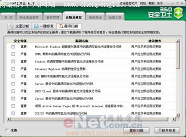 一键修复所有系统安全漏洞 ——360安全卫士V1.7新版测试 近一段时间来,360安全卫士出尽风头,已经成为“装机必备”,而且其版本更新非常频繁,短短一个星期之内,更新多达6次以上!近日,其1.7最新版本发布,其中将给网民带来什么样的惊喜呢? 一、一键搞定所有系统安全漏洞 从360安全卫士站点的更新日志中我们发现,V1.7新增了一个“漏洞修复”功能。下载并运行之后,切换到“诊断及修复”标签,这里多出了一个“漏洞扫描”菜单。