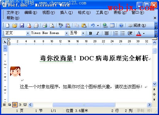 夏季,是个“病毒”多发的季节,电脑病毒也不例外,尤其是危险系数很大的doc病毒(Virus宏病毒)既是在利用IE浏览器访问网络上的doc页面时,也会被莫名其妙的给“黑”了一把。那么doc到底是一种什么病毒啊,它是怎么黑的自己的宝贝电脑呢?现在我们就看一看,doc病毒到底是什么模样。 宏病毒,它是利用了一些数据处理系统内置宏编程指令的特性而形成的一种特殊病毒。它和其他一般的个体病毒不同,它是依附在正常的Word文件上,利用Word文档可执行其内宏命令代码的方式,在Word文档在打开或关闭时来控制并感染系统。它的这种特性,曾使许多人着了它的道,轻则文件被破坏,重则格式化硬盘,使数据毁于一旦,看来,宏病毒果然是个可怕的角色。 宏病毒既然这么厉害,那它是通过什么途径传播的呢?最简单的是将它放到网页上,并给它建立一个连接,当浏览者点击该连接时,浏览器就会将该doc文档下载,然后自动启动Word打开该文档,,当文档被打开时,病毒也就被执行了。很可怕吧,也许你还不知道,自己当前正在观看的某Word文档就轻而易举的把你黑了。先不要怕,下面看看它是如何制作的,肯定有办法将它拒之门外。 为了说明简单,笔者为教大家做一个简单的宏病毒,以此来了解宏病毒的作用机制,请大家不要模仿这个来搞“小动作”啊,不然,警察叔叔要请你喝茶我就没办法了^_^。首先启动Word2000/XP,在窗口菜单栏中选择“插入”→“对象”,在弹出的图1所示的窗口中选择“对象类型”列表的“包”单选项,然后点击“确定”。