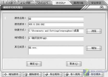 如今各种网游盗号软件层出不穷,让人防不胜防。笔者最近在使用“瑞星2006防火墙”时发现它内嵌了“木马墙”功能,利用它可以监测和防止受保护游戏的账号和密码等信息外泄,从而起到防止账号被盗的作用。 打开“瑞星2006防火墙”,切换到“游戏保护”窗口,点击“增加游戏”按钮,弹出“编辑游戏规则属性”窗口,在“游戏名称”和“游戏版本”框中输入游戏名和和当前游戏版本号,点击“快捷方式”框的“浏览”按钮添加用来启动游戏的快捷方式文件,点击“确定”按钮即可(如图)。以后当运行该游戏后,“瑞星2006防火墙”就会提示“系统监测到某某游戏正在运行,防火墙已切换到游戏保护模式”。 之后若有其它程序访问游戏程序时,“瑞星2006防火墙”就会立即提示报警并阻止该程序做更进一步的操作,比如生成包含游戏账号和密码的文件,或是检测到有不明程序向外发送包含该游戏账号的邮件时,“瑞星2006防火墙”会禁止它发送。这样就直接阻止了各种盗号软件的操作使它无法窃取到游戏账号信息了。对于QQ、MSN等程序都可以相同的方法来进行保护。