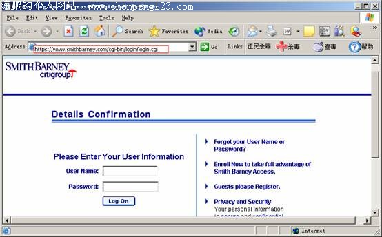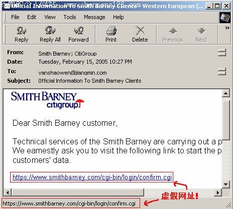 目前,网上一些利用“网络钓鱼”手法,如建立假冒网站或发送含有欺诈信息的电子邮件,盗取网上银行、网上证券或其他电子商务用户的账户密码,从而窃取用户资金的违法犯罪活动不断增多。公安机关和银行、证券等有关部门提醒网上银行、网上证券和电子商务用户对此提高警惕,防止上当受骗。 “网络钓鱼”的主要手法 一是发送电子邮件,以虚假信息引诱用户中圈套。 诈骗分子以垃圾邮件的形式大量发送欺诈性邮件,这些邮件多以中奖、顾问、对帐等内容引诱用户在邮件中填入金融账号和密码,或是以各种紧迫的理由要求收件人登录某网页提交用户名、密码、身份证号、信用卡号等信息,继而盗窃用户资金。 如今年 2月份发现的一种骗取美邦银行(Smith Barney)用户的帐号和密码的“网络钓鱼”电子邮件,该邮件利用了IE的图片映射地址欺骗漏洞,并精心设计脚本程序,用一个显示假地址的弹出窗口(如下图红色框)遮挡住了IE浏览器的地址栏,使用户无法看到此网站的真实地址。当用户使用未打补丁的Outlook打开此邮件时,状态栏显示的链接是虚假的。如图: