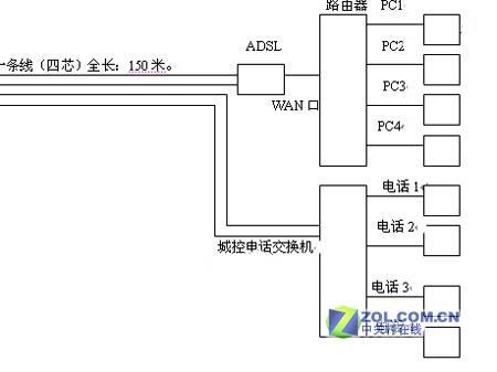 前些天,一家贸易公司在华强电子商城购买了一台ALPHA G3路由器,用于商业上网。可客户提出在使用过程中局域网中所有的电脑平均每小时会掉五六次的掉线情况。以至使他们无法正常上网,接到电话后,笔者连同阿尔法技术人员赶到现场。首先对该公司的网络进行了了解,他们是在电信申请的2M宽带的ADSL包年交费。所用的ADSL是申请宽带时电信附送的。其公司的电话线及网络分部图如下: