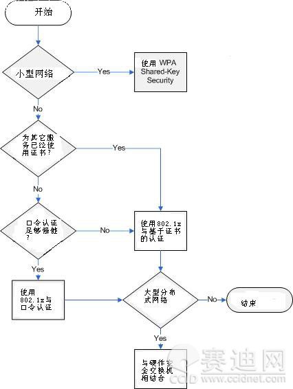 在本文中笔者仅涉及了几种最常见的保障无线网络安全的方法。说实话,当你将数据通过无线信号传输时,实际上是将数据置于风险之中。我们所希望的是通过实施这里讨论的一些措施来减少风险。那么,这些方法哪一个更适合于你的网络呢?为了回答这个问题,笔者手工绘制了一张流程图(下图4),不过不要完全依赖它。在实施一项安全方案之前,你应当缜密地审查流经无线网络的信息的敏感性。