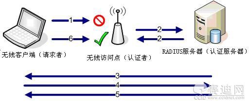 上图表明:802.1x依赖于一个EAP和一个RADIUS服务器来管理身份验证。其中:1表示客户端与拒绝通信的访问点联系,2表示访问点完成与认证服务器的一次握手,3表示认证服务器向请求者索要身份证明,4表示请求者用所指定的身份验证方法响应要求,5表示认证服务器向请求者提供一个会话密钥,6表示请求者现在与验证服务器和访问点同步,并能够在无线网络上通信。