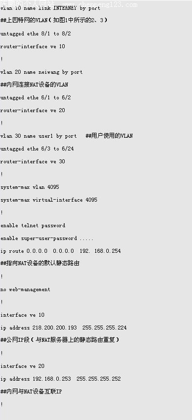 (2)NAT服务器设置的静态路由如下:在连接内网的网卡上设置:ip route 192.168.0.0 255.255.254.0 192.168.0.253。在连接外网的网卡上设置:ip route 0.0.0.0 0.0.0.0 218.200.200.193 (与交换机interface ve 10路由重复)