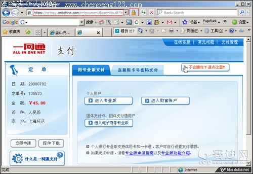 情景3:听信谣言捡便宜,同时丢掉网银帐号和游戏帐号 玩儿游戏的人估计见过,常有人会和你套近乎,然后说某天发现游戏一充值BUG,照此操作就能白捡**好处若干。 分析: 这是典型的网络欺诈,如果你信以为真,照葫芦画瓢,不去检查页面是不是官方的充值页面。就会同时把网银帐号和游戏帐号送人。 威胁程度:★★★★★ 处方:记住,天上不会掉馅饼,大大小小都不会。只认准官方充值页面,并且厂商为了安全,所有充值页面都会是https加密的,浏览器的状态栏会有一把小锁。尽量使用网络银行的专业版,有证书的保护,会安全很多。 注意看下面这个例子: 网银【编辑点评:最好的解决办法——便宜莫贪!】