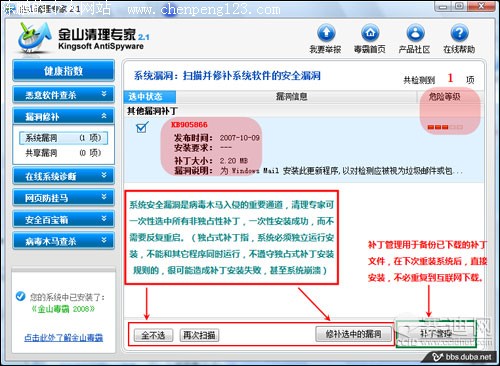 情景1:看游戏秘笈中木马 玩家小花旦在游戏里想合成几件极品装备,缺钱缺经验,得到网上找找看别人有没有好的点子。结果无意中看到一贴“合成黄金装备秘诀,别被GM看见”,受此标题吸引,小花旦点击浏览。页面几个跳转之后,也没发现自己需要的内容,系统慢慢变卡。游戏速度变慢,下线。重新登录后,发现自己的帐号已经被洗干净了。 分析: 小花旦的电脑极可能没有修补浏览器漏洞、Flash Player漏洞和RealPlay漏洞,导致浏览网页下载带毒网页木马,木马利用漏洞入侵完成游戏盗号。小花旦感觉网速变慢时,可能是木马下载器正在进行下载动作或者和向远程服务器上传盗窃的信息。 威胁程度:★★★★☆ 处方:打补丁,没二话。什么?不会打补丁?去用金山清理专家帮你打吧,你要不愿意,就只好等着再次被盗号。 利用安全工具为系统打补丁【编辑点评:喜欢玩游戏的朋友,总是想找找秘笈、修改器什么的,现在看来这个“捷径”已经被木马盯上了。】