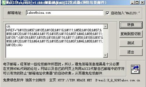 使用方法:运行 Mail2Encoder,在“邮件地址”栏输入要隐藏的Email地址(例如labxw@sina.com),点击“转换”按钮,该Email地址就会转换成一串ASCII代码(如图1);然后你选中该代码,点击“复制到剪贴板”,把该代码粘贴在网上需要的地方,这样别人在网页中能够看到你的Email地址labxw@sina.com,但是垃圾邮件程序搜索到的却是一串ASCII代码、无法收集你的Email,从而预防垃圾邮件。