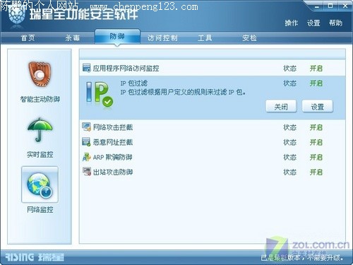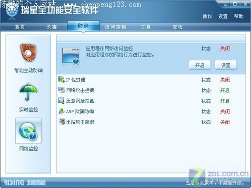 今天,给大家详细介绍一下瑞星全功能安全软件2009的网络监控功能。默认情况下,瑞星2009网络监控功能组件下的“网络攻击拦截”和“恶意网址拦截”功能均处于“开启”状态,而“应用程序网络访问控制”、IP包过滤、ARP欺骗防御、出站攻击防御四个功能却处于“关闭”状态。对于关闭的这四个功能,它们对系统的安全又起什么样的作用呢?今天,笔者就给大家详细介绍一下这四个功能,以便你根据自己的需要适时地开启某些相应的功能。