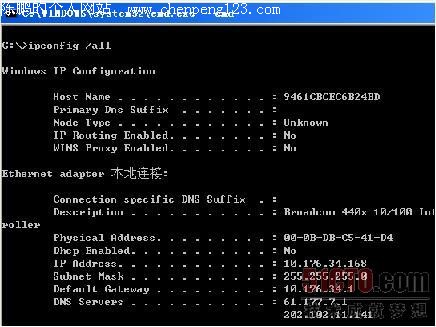 为了检验故障工作站有没有从DHCP服务器那里获得合适的IP地址,笔者特意将目标工作站系统切换到DOS命令行工作状态,在该状态的命令行提示符下,执行字符串命令“ipconfig /all”,在如图2所示的结果界面中, 笔者发现目标工作站系统使用的IP地址为“10.176.34.168”,不过该地址明显不是由B网中的DHCP服务器分配的,因为DHCP服务器设置的地址池范围为192.168.0.2-192.168.0.254,这难道是局域网网络中还同时存在另外一个DHCP服务器?经过笔者仔细检查,果然发现计划处办公室中使用的ADSL拨号上网设备,也自带了DHCP服务功能,并且该功能已经被网络公司的人设置并开通,而先前目标工作站获得的“10.176.34.168”地址其实是由该DHCP服务器分配的,那么使用这样的IP地址,目标工作站自然就无法成功访问到B网络了。