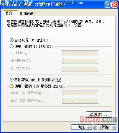 考虑到连接到B网络中的所有工作站,都是从局域网的DHCP服务器那里获得IP地址的,因此在正式访问B网络之前,笔者尝试着打开计划处办公室中的工作站网络连接,进入其中的TCP/IP属性设置窗口,选中“自动获得IP地址”选项(如图1所示), 原以为这样就能顺利地访问B网络,可是笔者发现目标工作站竟然不能访问B网络,这难道是计划处办公室中的工作站无法从局域网DHCP服务器那里获得有效的上网地址?