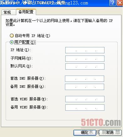 其次在该设置对话框的“常规”标签页面,选中“自动获得IP地址”选项,之后单击“备用配置”标签,打开如图3所示的标签设置页面, 在该页面中选中“用户配置”选项,同时在对应各个文本框中输入对应A网的IP地址、子网掩码、网关地址等参数,假设笔者在这里输入的A网络IP地址为10.176.34.168、网关地址为10.176.34.1,子网掩码为255.255.255.0,最后单击“确定”按钮保存好上述设置操作。