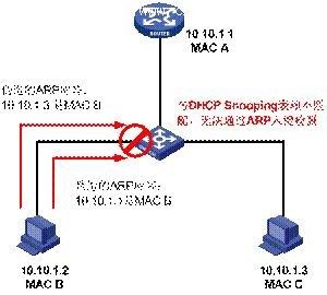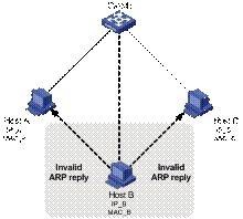 电信级IP技术的发展成熟使得话音、数据、视频和移动等应用的融合成为必然,统一通讯已成为发展的趋势。以IP技术为核心进行网络改造并承载多种新型业务以提升竞争力,是固网运营商的发展方向。而以太网技术由于标准化程度高、应用广泛、带宽提供能力强、扩展性良好、技术成熟,设备性价比高,对IP的良好支持,成为城域网和接入网的发展趋势。但是,由于以太网技术的开放性和其应用广泛,也带来了一些安全上的问题。特别是当网络由原有的单业务承载转为多业务承载时,安全问题带来的影响愈发明显,已经逐步影响到业务的开展和部署。 目前接入网常见的攻击包括ARP“中间人“攻击、IP/MAC欺骗攻击、DHCP/ARP报文泛洪攻击等。 网络攻击 ARP“中间人”攻击 按照ARP协议的设计,一个主机即使收到的ARP应答并非自身请求得到的,也会将其IP地址和MAC地址的对应关系添加到自身的ARP映射表中。这样可以减少网络上过多的ARP数据通信,但也为“ARP欺骗”创造了条件。 如下图示,Host A和Host C通过Switch进行通信。此时,如果有黑客(Host B)想探听Host A和Host C之间的通信,它可以分别给这两台主机发送伪造的ARP应答报文,使Host A和Host C用MAC_B更新自身ARP映射表中与对方IP地址相应的表项。此后,Host A 和Host C之间看似“直接”的通信,实际上都是通过黑客所在的主机间接进行的,即Host B担当了“中间人”的角色,可以对信息进行了窃取和篡改。这种攻击方式就称作“中间人(Man-In-The-Middle)攻击”。