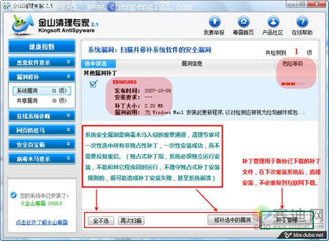 一 最最重要的,是修补系统漏洞 知道网吧里为什么经常丢游戏帐号吗?因网吧里的电脑先天不足,很多网吧使用还原卡,而装了还原卡的机器,补丁是没法打的,因一次重启,补丁就白打了,这样的系统,上网就是菜。 推荐的打补丁方案: 1.windows update微软官方免费的客户端补丁管理系统,当然应该列为首选。新版的windows update已经变身为microsoft update,可以为MS全系列产品扫描安装补丁。正版用户的服务,是一定要用的。 2.微软官方的漏洞检测系统MSBA2.1 3.金山清理专家的漏洞扫描修复功能 更新必须等微软发布之后,有时间差,但可以帮助没有合法授权的windows 用户修补系统。