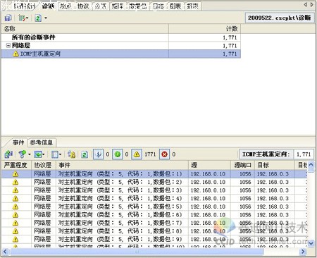 首先,通过科来的概要统计来看,网络的流量、广播流量、数据包大小分布以及TCP连接的信息均没有发现异常,随后,在诊断视图下看到,发生的网络事件全是ICMP主机重定向,达到了1771次,如下图1: