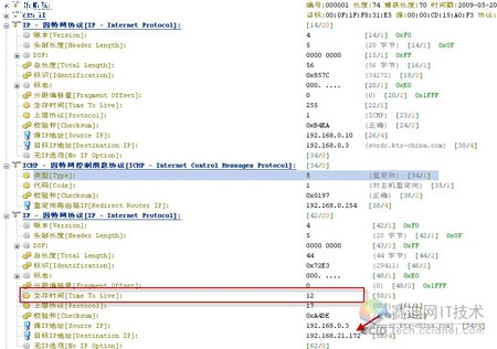 继续看第4、第5以及后面的数据包,TTL值一直在递减,直到第13、14个数据包时,TTL值为0,显示超时。所以,从第1个数据包到第14个包,ICMP数据包里面的IP报头的TTL值不断递减,直到TTL超时,因此,明显是网络中产生了环路才会造成这种现象。而从数据包地址来看,产生ICMP重定向的地址全是192.168.21网段的主机IP,可能是在抓包的同时,正好是这个网段的主机与192.168.0.3通讯时产生了该事件。