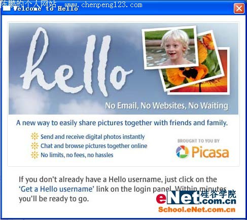Hello是Google推出的一款类似于MSN的聊天软件,Google出手当然不同凡响,无论如何,都值得我们关注,本文将从Hello的基本使用和技巧入手,让大家了解这款软件的庐山真面目。 下载地址:http://www.ppcn.net/p2psoft/Hello.exe 一、安装注册 安装后的欢迎界面如图1:
