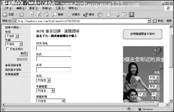 很多朋友都在使用MSN Messenger跟朋友联系,不过MSN Messenger跟QQ比,一个最大的弱点就在于它不能查找添加在线好友,而只有知道朋友的邮件地址才能添加其为好友。其实通过MSN Messenger一样可以认识许多陌生人,只不过这个功能比较隐蔽而已。 第一步:登录MSN Messenger后,选择“联系人→搜索联系人→高级搜索”菜单或者直接在IE中打开http://members.msn.com/find.msnw页面,这里我们可以看到类似一个QQ中的分类查找好友的界面。 提示:该站点页面编码为繁体中文,如果你浏览的时候页面显示乱码,请根据提示安装繁体中文支持。 第二步:接下来大家既可以通过MSN昵称、性别、年龄、国家/地区等条件进行搜索,也可以点击页面右侧的“依兴趣浏览基本资料”来分类查找与你有共同爱好的好友。在检索之前,勾选“仅检查包含图片的基本资料”,这样你可以先看看搜索到的好友照片,如图所示。
