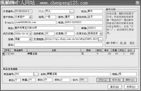 对于拥有众多“网店”的用户来说,管理交易是最头痛的事情,因为每天必须登录多个网站来查看交易情况,今天给大家介绍的这个软件就能帮你管理交易,让你轻轻松松地当老板! 软件小资料 软件名称:网店管家 软件版本:v1.5标准版 软件大小:4.69 MB 下载地址:点击下载 软件将交易过程分为了订单登记、联系客户、收款发货以及等待完成四个阶段,完成了这四步,你的交易也就成功完成了。 第一步:登记订单 首先要将网上成交的订单进行登记,点击“订单登记”会弹出“成交登记”窗口(如图1),分别在相应的输入框中,键入交易方的网名、真实姓名、地址以及交易方式、店铺等信息。再在“商品信息编辑”栏中,点击“添加”按钮,将商品的名称、规格、数量等信息添加到列表中。最后点击“登记”按钮,则该交易就被成功登记了。