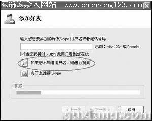 现在,大多数即时通讯软件都提供了音频服务,但是其效果却不能让人恭维,而TOM-Skype采用了先进的P2P技术,能够提供超清晰的语音通话效果,而且呼叫成功率非常高,还可以实现多方通话,甚至能拨打普通电话,这些特点都是一般的聊天工具所无法媲美的。下面我们一起来体会一下它的强大功能。 一、注册并添加好友 第一次启动TOM-Skype时,就会弹出注册账户的窗口,按照注册向导的提示进行填写即可完成注册过程。使用刚刚注册成功的用户名和对应的密码就可以登录软件了,第一次使用TOM-Skype,首先要添加好友。 在主界面中,点击“工具”菜单下的“添加好友”,就会弹出添加好友的对话框(如图1),输入好友的用户名,然后点击“下一步”,按提示操作即可完成添加好友操作。