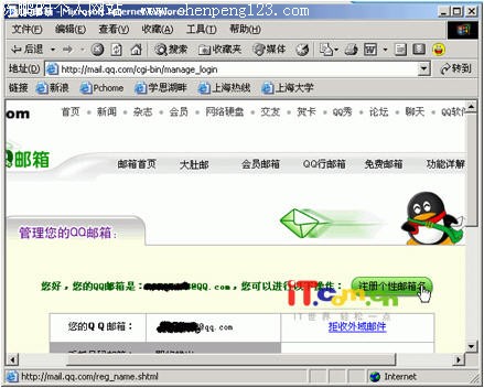 现在的即时聊天软件的附加功能是越来越多,做为其中翘楚的QQ当然也不例外。笔者偶然间发现了几个非常实用有趣的技巧,在此写出来于大家一起分享。 个性化的邮箱名 大家都知道QQ提供了QQ邮箱,点击QQ面板中的信封图标就可以收发邮件(如果你没有开通赶快去开通噢)。不过初始的邮箱名都是QQ号码@qq.com。比如你的QQ号码是17727757,那么你的QQ邮箱地址就是17727757@qq.com。其实,在腾讯的网页上申请一下,就可以个性化你的邮箱名,你可以取你想要的名字作为你的QQ邮箱名称。 打开IE,在地址栏中输入http://mail.qq.com/manage.shtml,进入QQ邮箱web管理界面(图1)。输入你的QQ号码、密码已经网页上显示的附加验证吗,按“确定”按钮登陆。