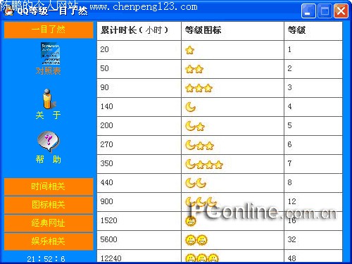 相信先有很多人都在使用QQ,但是QQ有很多功能并不完善,导致在使用上有一定的困难。这里我们就要借助一些软件,来完善QQ的功能,将QQ武装到牙齿。 QQ等级轻松查 大家都知道,腾讯QQ 2004II beta1全新推出在线时长功能,通过累积在线时长,就可以获取相应的QQ等级。但是有很多朋友对QQ等级的设置并不是很清楚,不知道在线多长时间可以获得什么样子的等级,这里给大家介绍一款名字为“QQ等级一目了然”的软件,通过这款软件就可以轻松查询QQ等级。 首先在“QQ等级一目了然”这款软件的主界面当中就可以看到在线时长对应的等级数和图标(图1),此外可以直接输入等级数(最多到500),然后马上就可以查询出来如果到这个等级需要在线多长时间。另外还可以查询升级时间,这里可以随意查询任意两等级的积累时间计算。还可以输入等级,然后查询相对应的图标。反过来也可以输入图标,来查询相对应的等级。这样就可以用“QQ等级一目了然”这款软件来轻松查询QQ等级,不用再为等级的问题而苦恼了。