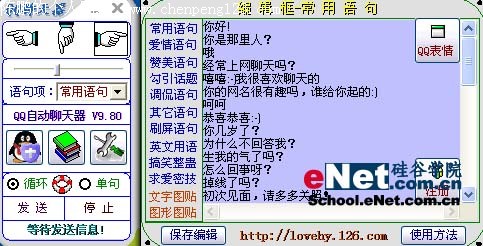 如今,上网聊天已经成了“家常便饭”了,如何才能让这顿“便饭”变成一道色、香、味俱全的美味大餐呢?当然要往菜里加上各种合适的佐料,下面就随笔者一起来看看如何使用好“自动聊天”这一调料,让你的聊天更炫、更酷! 1.QQ自动聊天 QQ自动聊天器 9.80就是为QQ准备的一味绝佳佐料!QQ自动聊天器 9.80汇集了QQ聊天的大部分常用工具,如:QQ贴图、QQ自动聊天消息、表情图等功能,广泛适用于Win9x/Me/NT/2000/XP,下面就来看看这道大餐是怎么“烹”出来的! 首先我下载了QQ自动聊天器的最新版本 9.80,安装也比较简单,按照提示操作即可顺利完成。运行软件,主界面如图1所示: