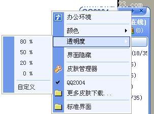 前段时间听朋友说腾讯QQ2004极其不好用,并且说宁可用回原来的2003版本,想想真是奇怪,2004版真的那么难用吗?其实不然。哪有说新版本比旧版本差的道理呢?特别是当你了解到如下新版本的技巧之后,相信就会对2004版略有改观了。 1. 办公室的QQ隐身 现在许多公司都禁止使用QQ,在开放式的办公场所,得学会让QQ隐身(不同于上线的隐身,是面板的隐身)。那如何让QQ像隐形人一样出入你的显示屏而不被别人察觉呢?只需点击主面板右上方加号所示"颜色编辑"按钮,在弹出菜单中选择"界面隐藏"即可。你也可以在弹出菜单的"透明度"选项中选择或是自定义界面的透明度,如图1。