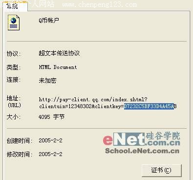 第二、在页面上点击右键->属性,这时会看到一段代码,把clientkey=后面的代码全部复制下来,这段代码是每个QQ号码独有的加密字段(如图3)。