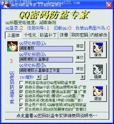 俗话说“人怕出名,猪怕壮”,这句话用在QQ身上是再合适不过了,自从QQ“火”了以后,各种针对它的密码窃取软件就如雨后春笋一般涌现,像什么QQ密码杀手、密码窃取器,简直是举不胜举!弄得现在大家每次上网都要随身带上各种各样的“防毒面具”,什么天网防火墙、金山网镖,可惜的是,这些“防毒面具”并非为QQ量身定做,所以QQ被盗的情况还是时有发生,虽然腾讯提供了密码保护功能,但这样总不是办法,因为即使能够找回自己的QQ,但通常上面的好友已经被盗号者删掉了。所以采用一定的防范措施就是必不可少的了。 QQ密码防盗专家 QQ密码防盗专家是作者通过深入研究各种盗密软件的工作原理而开发的一款QQ密码保护软件。它采用QQ标题动态更新法以及QQ子窗体内核属性修改法,从而切断各种QQ木马程序进行密码窃取的必要条件,能有效对付所有QQ盗密软件,包括后台监控QQ窗口、后台记录键盘、伪装QQ登录界面三大类QQ盗密软件。而且,该软件允许用户隐藏或伪装自己的QQ号码,让各种QQ号侦察软件无从下手。它还能够防止QQ盗密软件在用户修改密码时在后台记录下新密码。 运行QQ密码防盗专家,可以看到主窗体的最上面有QQ登陆、注册向导、旧版QQ、伪装QQ界面木马四个显示项,在往下有六个按钮选项,分别是:主窗体、个性化、QQ防盗补丁、注册、说明、内核修改(如图1)。