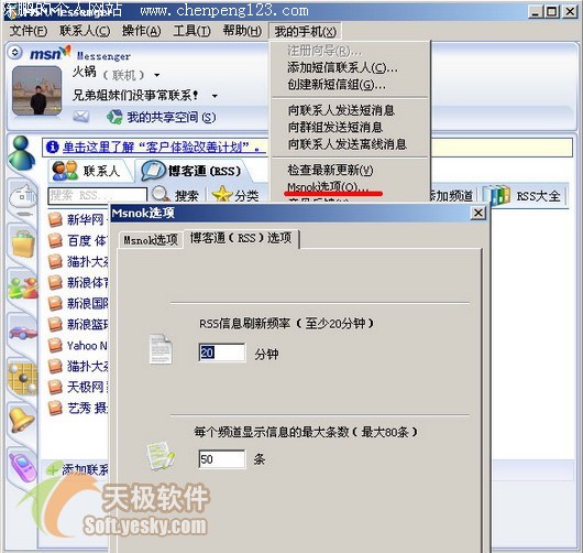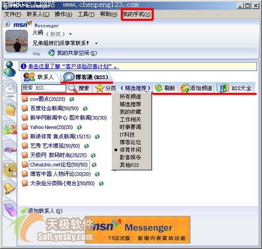 MSN以其强大的应用能力,亲切的用户界面而被用户所接受;RSS阅读器为用户快捷提供喜欢的新闻,免除了用户花费大量时间从网站搜索的烦恼,正受到越来越多用户的青睐。 是否有一种方法或技术能使二者有机地结合起来,更好地为广大读者服务呢?有,这就是由计算机世界网开发的全球首款IM+RSS软件MSNOK。 点击下载 MSNOK3.4 1、在MSN右边新增加了一项“博客通(RSS)”按钮,下面排列着“搜索”、“分类(精选推荐)”、“刷新”、“添加频道”、“RSS大全”五个按钮(如下图所示)。