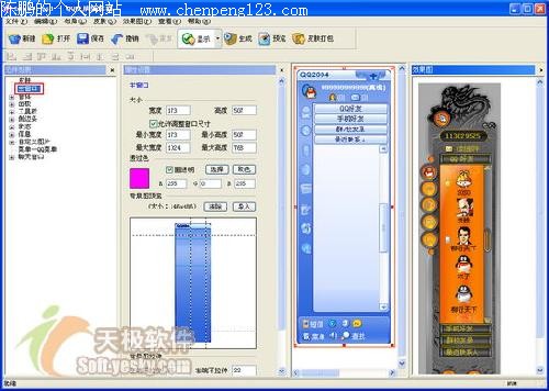 笔者上网多年,一直以来使用的聊天软件都是国产软件的骄傲——腾讯QQ,从QQ的 99 版开始使用,用到了如今的 2005 beta1 版。在这个过程中,常常下载安装试用一些QQ的辅助软件,其中有一些让笔者能更好地更方便地使用QQ。 现在我把这些好用的软件陆续介绍给大家,希望能对大家用好QQ有所帮助。 编辑器类 此类软件有QQ的皮肤编辑器和场景编辑器,它们都是腾讯官方的发布的软件。它们都可以在QQ的主页http://www.qq.com/下载得到。 皮肤编辑器 皮肤编辑器是用于制作QQ主窗口的皮肤的,用户可以通过“新建”按钮新建QQ的皮肤模板,然后选择“元件列表”中的元件,对它们进行属性设置和效果图预览。(下载QQ皮肤编辑器) 软件的主界面如图十六所示: