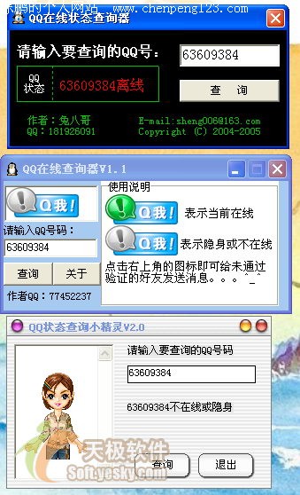笔者上网多年,一直以来使用的聊天软件都是国产软件的骄傲——腾讯QQ,从QQ的 99 版开始使用,用到了如今的 2005 beta1 版。在这个过程中,常常下载安装试用一些QQ的辅助软件,其中有一些让笔者能更好地更方便地使用QQ。 QQ周边软件集中营(上) QQ周边软件集中营(中) 现在我把这些好用的软件陆续介绍给大家,希望能对大家用好QQ有所帮助。 数据查询类 QQ在线查看器,QQ在线状态查询器,QQ状态查询小精灵 这三个小软件之所以放到一起来说是因为它们的功能非常的相似,都是能够在用户不登录任何QQ的情况下面快速查询别的QQ号码是否在线的程序,这就使得我们在登录QQ前可以决定是否登录,或是决定是否隐身登录。(下载QQ在线查看器)(下载QQ在线状态查询器)(下载QQ状态查询小精灵) 需要注意的是,它们都不能查看网友的隐身状态,未免有点美中不足。不过现在能查看隐身状态的软件不多,除了LumaQQ和传美版QQ之外,据(LumaQQ的作者)说珊瑚虫QQ也可以很方便的实现(只是珊瑚虫QQ作者soff不愿意实现这个功能)。这几个在线状态查询器的截图如下图三十一所示: