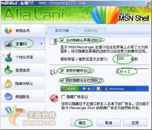 MSN Shell为MSN增加了象qq一样的自动隐藏功能,将MSN的主窗口隐藏到屏幕的边缘,当它隐藏后,移动鼠标到屏幕的边缘或按下预先设定的快捷键可以使它重新显示;MSN Shell也提供了不在任务栏显示图表的功能。